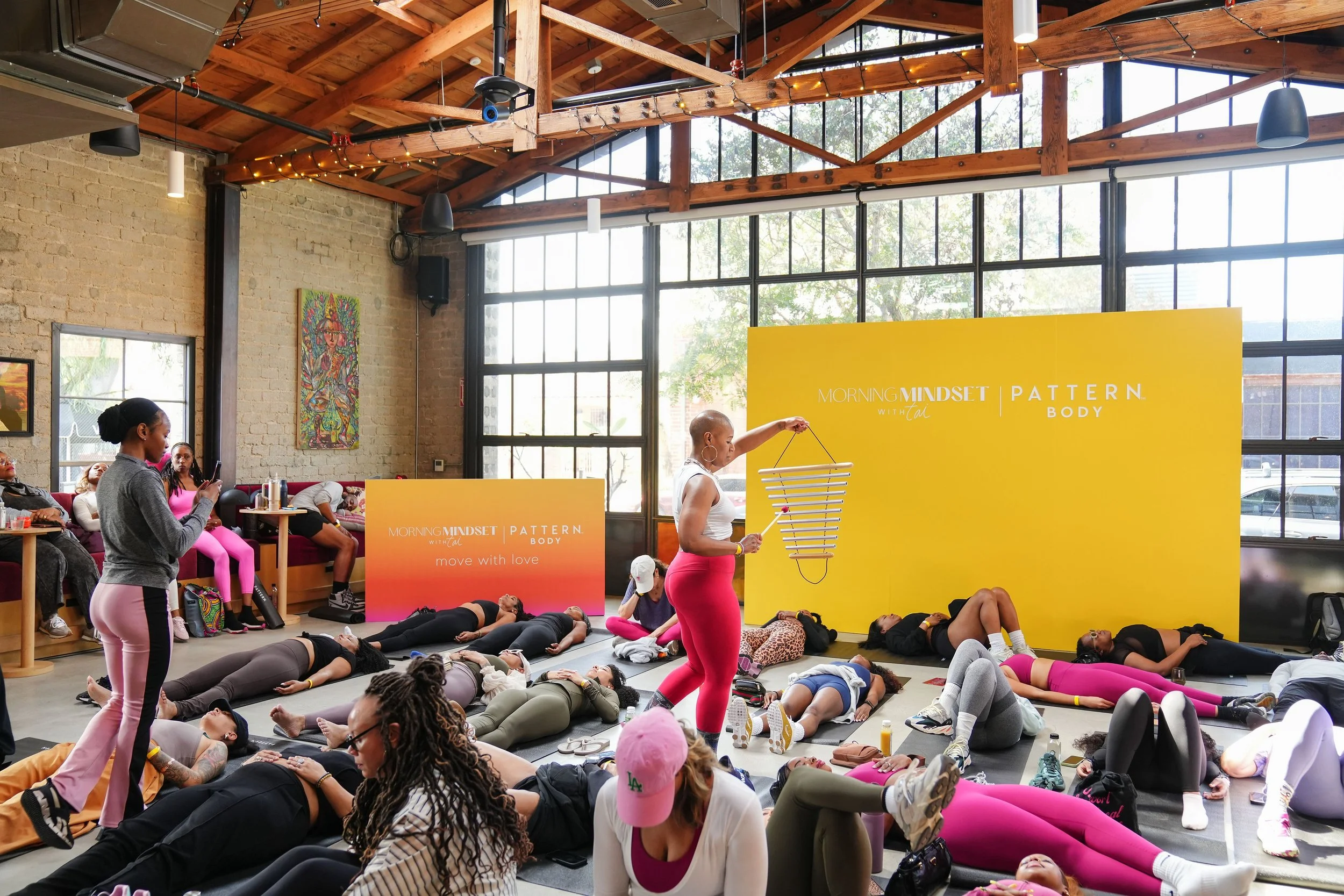 Leading a Soundbath at Morning Mindset with Tai | Pattern Beauty Event Photo by Kaye McCoy